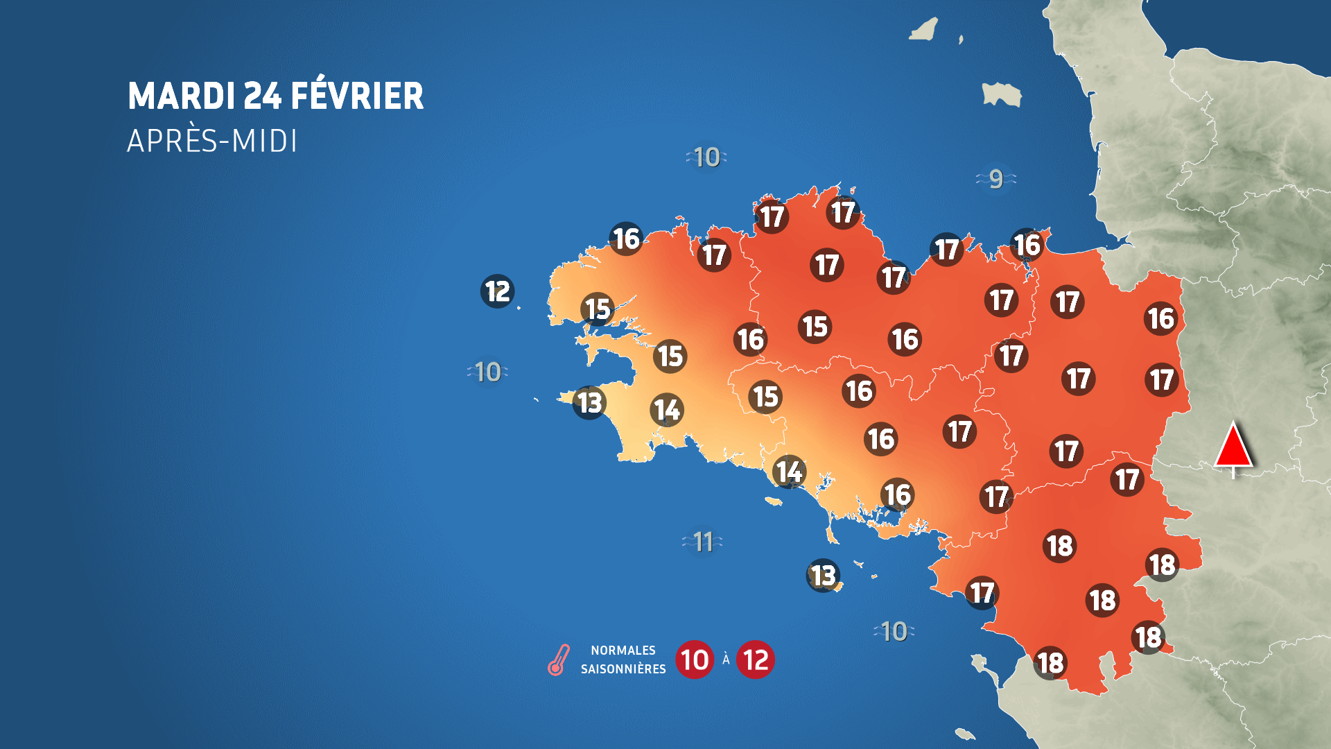 Les températures grimpent entre 12 et 18°C. On attend 12 à 13°C le long du littoral atlantique et sur l’ouest finistérien mais 14 à 18°C sur le reste de la région ! Le nord de la région notamment profite d'une belle douceur avec 16 à 17°C avec Morlaix, le Trégor, le pays de la Rance et la baie du Mont Saint Michel, 16 à 17°C aussi sur l'Ille-et-Vilaine et le maximum est attendu en Loire Atlantique avec 18°C sur les pays nantais, d'Ancenis et de Clisson. Des valeurs dignes d’un mois d’avril.
