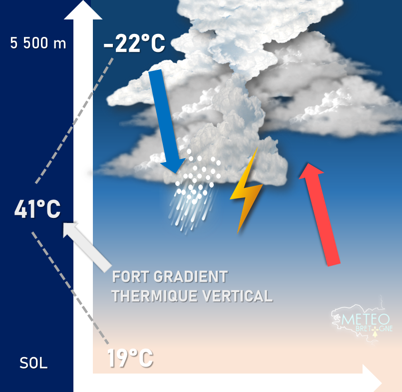 Le passage de cette goutte froide, conjugué à l’avancée dans la saison (avec des basses couches de l’atmosphère davantage réchauffées par le soleil), va provoquer un gradient thermique vertical marqué. À titre d’exemple, pour mercredi (voir schéma ci-dessous), où le risque orageux semble être le plus important à court terme, l’écart de température entre le sol et l’altitude d’environ 5 500 m (niveau classiquement utilisé en prévision météorologique, correspondant à 500 hPa) sera de 41 °C, une valeur notable.