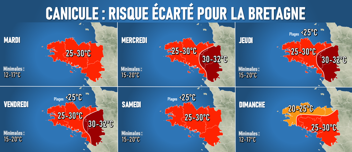 Mercredi, jeudi et vendredi sont des journées assez similaires et très estivales. La chaleur s'impose partout et celle-ci est même pesante en direction de l'est où la barre des 30°C devait être dépasser dans des villes comme Rennes, Nantes, Redon ou Châteaubriant. Les nuits s'annoncent douces avec des températures qui ne s'abaissent pas sous les 15°C. Il est probable qu'on parle de "nuit tropicale" dans les villes puisque la température devrait péniblement durant cette période de trois jours s'abaisser sous les 20°C.