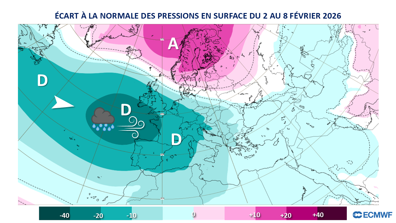 Les basses pressions vont se maintenir au moins 8-10 jours encore entre l’Atlantique Nord et l’’Europe de l’Ouest. Le menu météo s’annonce perturbé ; nous resterons situés sur le rail des dépressions océaniques avec des passages pluvieux et venteux répétitifs favorables à la poursuite et à l’extension des inondations.