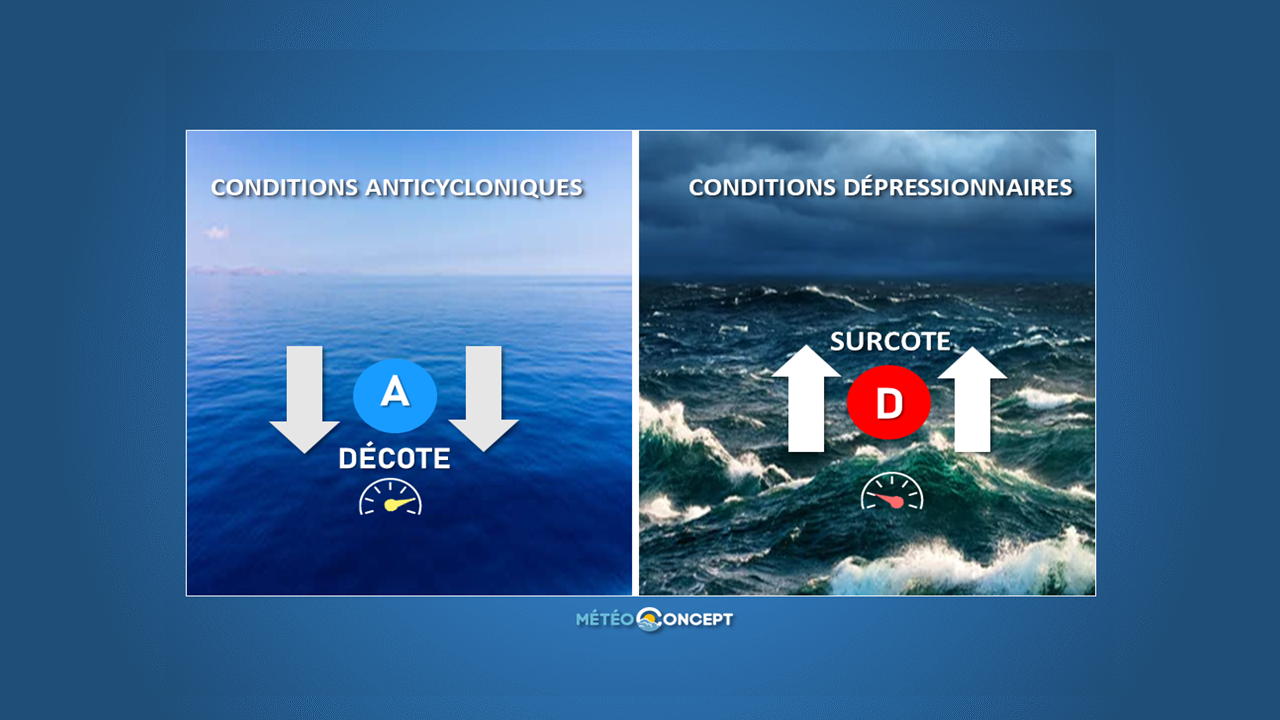 Le vent fort associé à une pression atmosphérique basse et à une houle importante provoque une surcote marine c’est-à-dire que la mer monte encore plus que la marée théorique, ce qui accentue le blocage à l’embouchure et favorise les submersions côtières. Nous avons déjà vécu ce type de configuration la semaine dernière avec la dépression Ingrid où une surcote de plusieurs dizaines de centimètres avait été observée sur le littoral Atlantique.