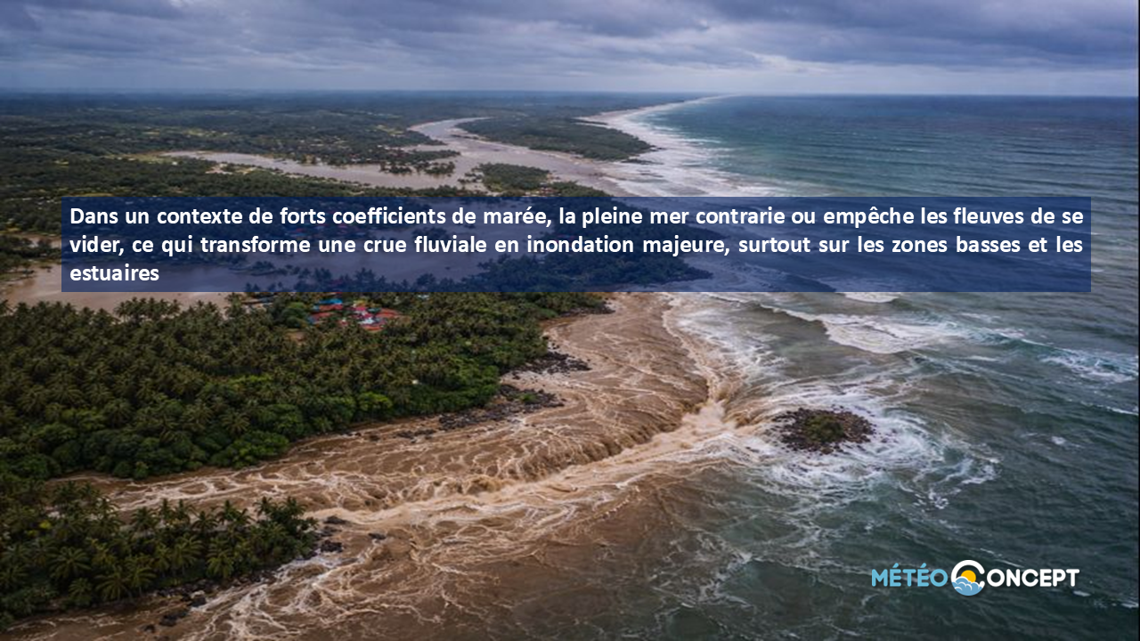 A marée haute, le niveau marin est très élevé et s’oppose à l’écoulement du fleuve vers l’océan créant un effet de « bouchon ». À marée haute, l’eau de mer peut pénétrer dans l’estuaire ou le fleuve déjà gonflés par les pluies, réduisant encore la capacité d’évacuation et augmentant l’étendue des zones inondées, parfois assez loin à l’intérieur des terres constituant un véritable effet de barrage naturel. Comme l’eau ne peut pas s’échapper efficacement, le niveau du fleuve monte plus vite, les plaines inondables débordent plus largement, les digues peuvent être dépassées ou fragilisées. Même une crue “modérée” peut alors provoquer de fortes inondations.