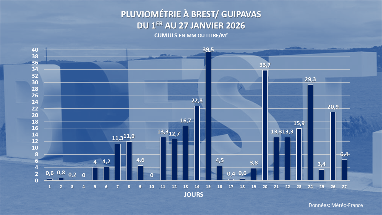 Les pluies ont été rares et faibles du 1er au 4 janvier. A partir du 5, elles sont devenues régulières. C’est entre le 11 et le 16 janvier que nos sols sont devenus saturés. Les forts cumuls observés à plusieurs reprises à partir du 20 ont entrainé une réaction rapide des cours d’eau. Les crues ont fini par provoquer des inondations majeures entre le sud du Finistère et le Morbihan. Le 27 janvier, la station de Brest-Guipavas enregistre un record mensuel de précipitation. Il s’agit du cumul mensuel le plus élevé depuis l’ouverture de la station en 1945. A 4 jours de la fin du mois, Brest se rapproche de son record absolu de pluviosité qui date de décembre 1965 (330, 8 mm).