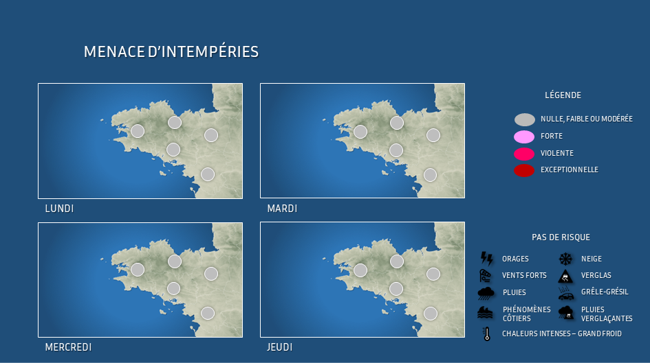 Les minimales sont plus basses que les jours précédents avec 11°C au Faouët, 12°C à Merdrignac, 13°C à Louvigné-du-Désert, 14°C à Nantes, 15°C à Auray, 16°C à Hennebont et 17°C à Belle-Ile.
