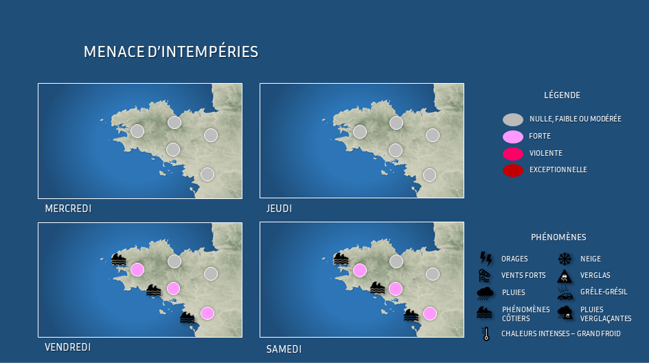 Un temps d'averses se maintient pour vendredi et samedi. Elles sont fréquentes en bord de mer avec des coups de tonnerre. Le vent est actif sans atteindre les seuils de coup de vent. Les températures sont aux alentours des normales saisonnières.