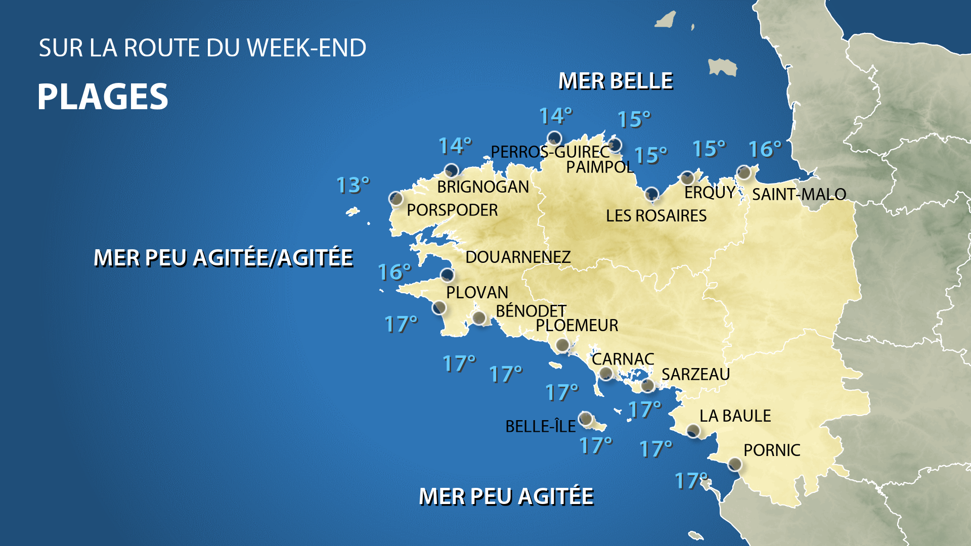 La température de la mer en surface affiche désormais 13 à 16°C en Manche, 13 à 15°C sur le littoral d’Iroise et 16 à 17°C sur le littoral sud.