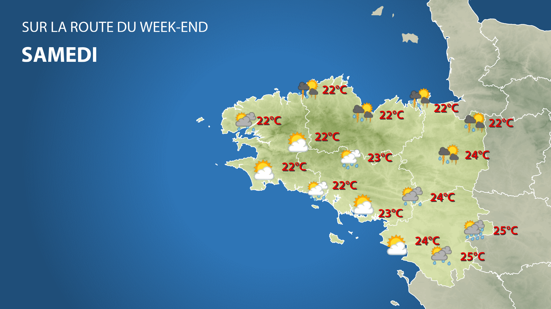 Samedi, le temps s’annonce variable entre passages nuageux et éclaircies. Un risque d’averses existe. Ce risque est plus important entre le Trégor, la Baie du Mont-Sain-Michel, l’Ille-et-Vilaine et le nord-est de la Loire-Atlantique où elles pourront prendre une tournure orageuse.
