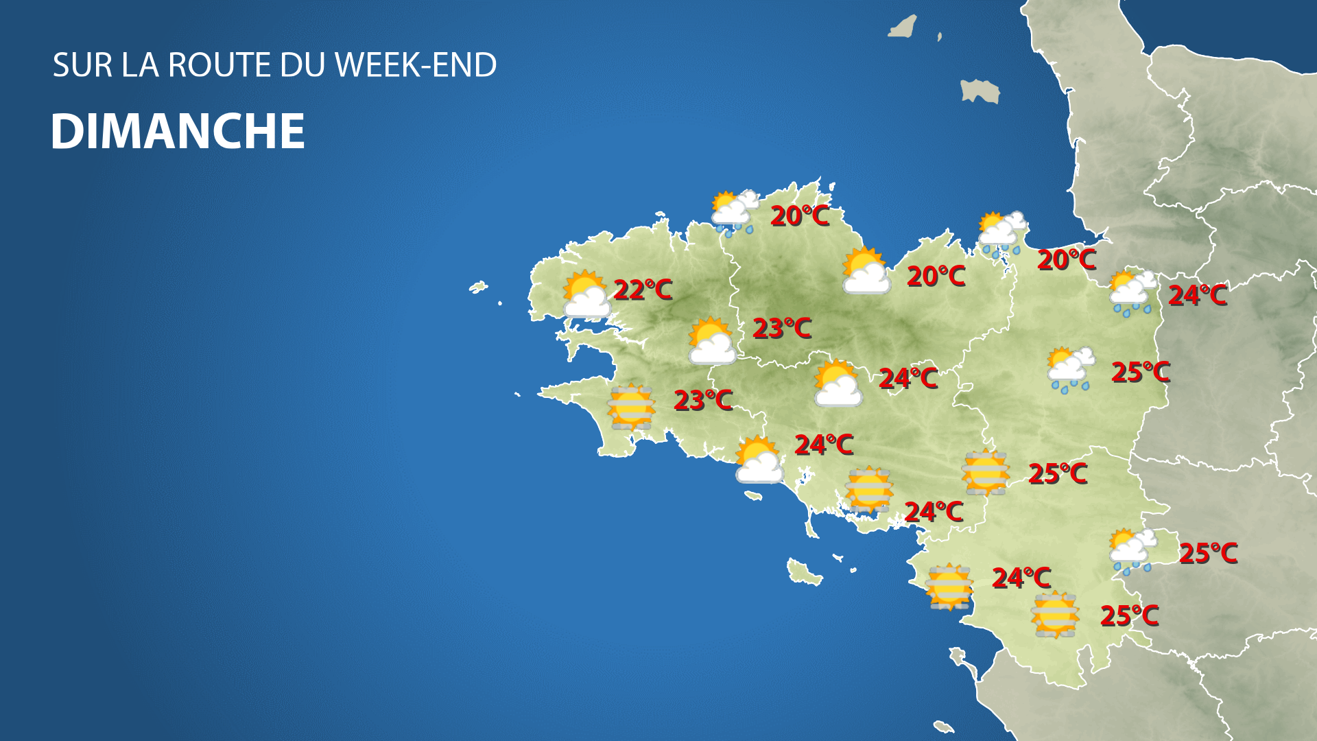 Dimanche, le ciel est partagé entre éclaircies et nuages. Le risque d’ondées est plus limité que la veille. Elles seront encore possibles localement du littoral nord au Pays de Fougères.