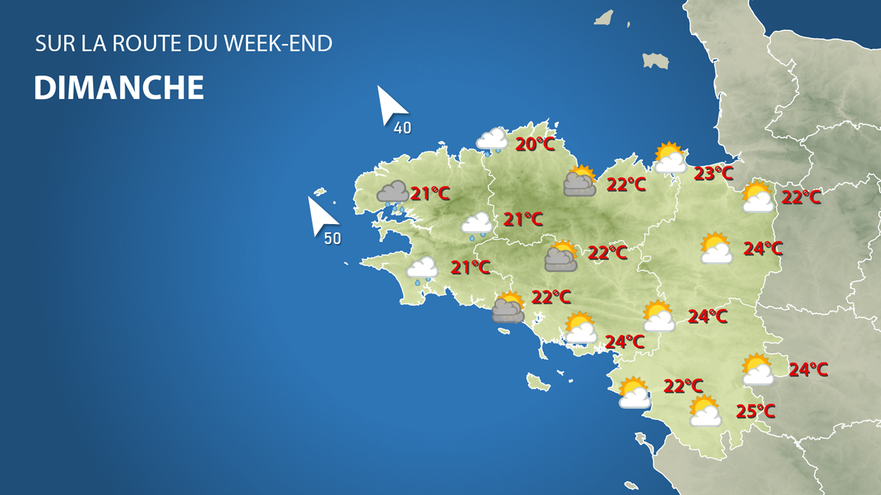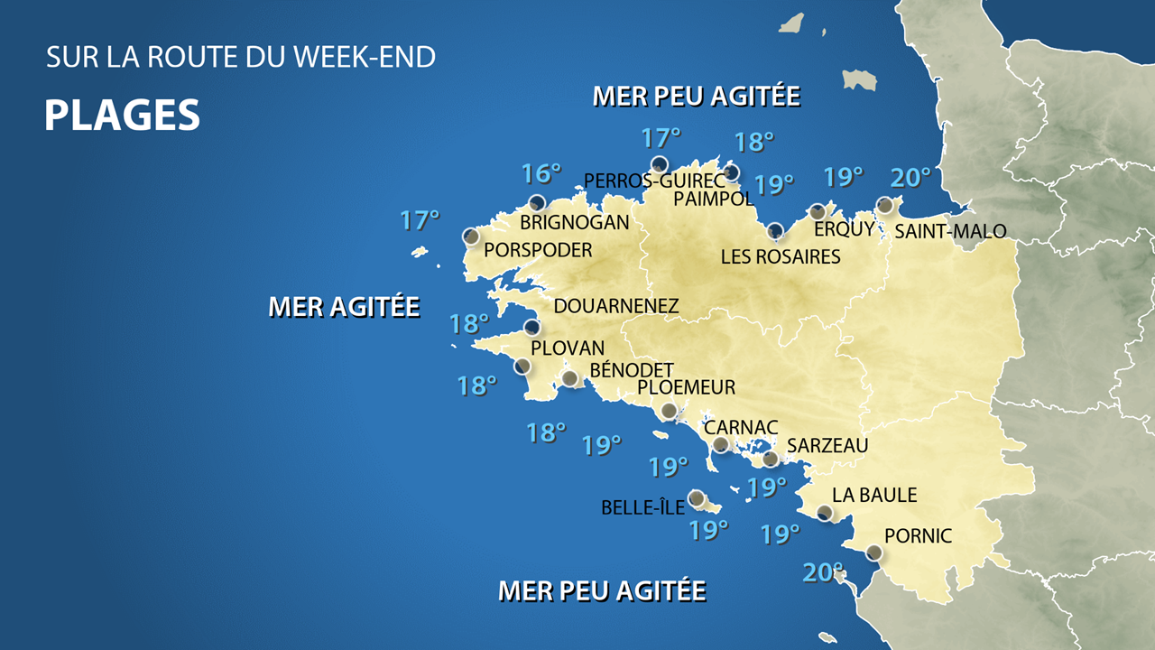 La température de l’eau affiche 16 à 20°C. On relève 16°C à Brignogan, 17°C à Perros-Guirec, 18°C à Bénodet, 19°C à Pléneuf-Val-André et 20°C à Cancale et Pornic.