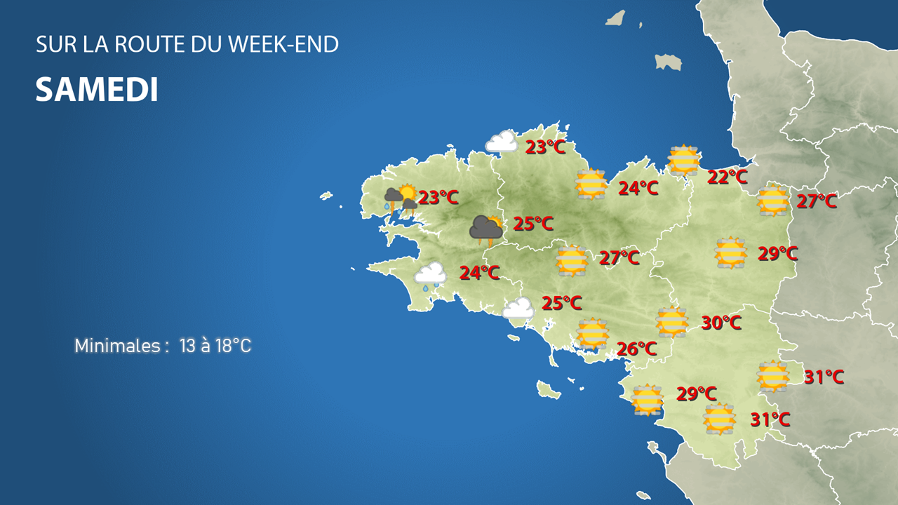 Les températures atteignent un niveau estival. Il fait même très chaud entre le Bassin de Rennes et la Loire-Atlantique où les températures maximales atteignent 28 à 31°C.