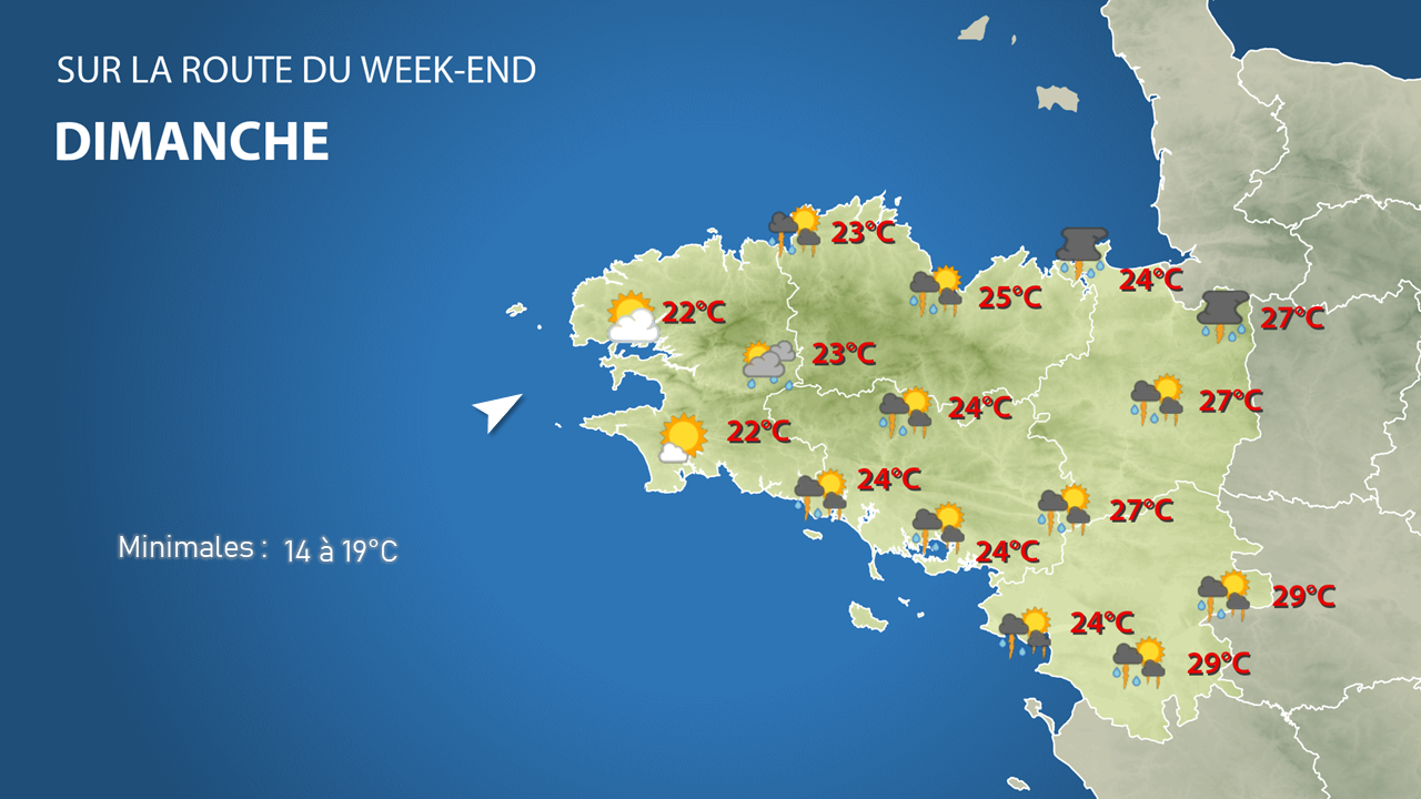 Les maximales affichent 22 à 29°C du Finistère à la Loire-Atlantique en passant par 23 à 25°C sur le Centre-Bretagne.