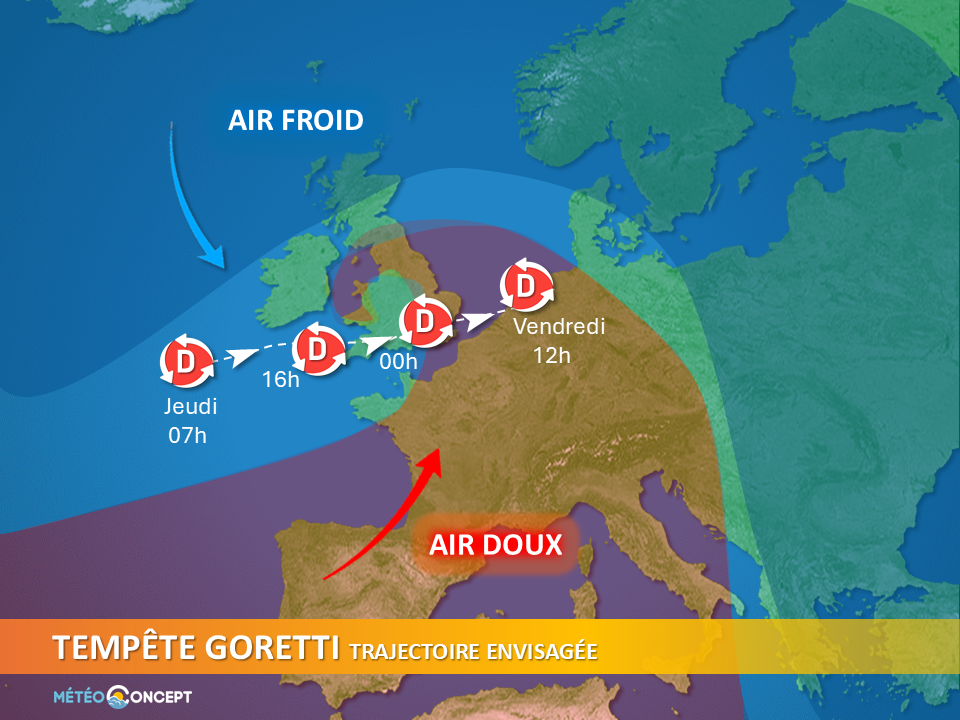 Situé au large, du sud-ouest de l’Irlande jeudi matin, au sud de l’Irlande jeudi après-midi puis sur la Cornoauille anglaise vers 19 heures, Goretti sera en phase de creusement lorsqu’elle passera au plus près de la Bretagne. Le cœur dépressionnaire devrait longer le sud des Côtes anglaises entre la soirée et le milieu de nuit de jeudi à vendredi avec une pression atmosphérique inférieure à 970 hPa.