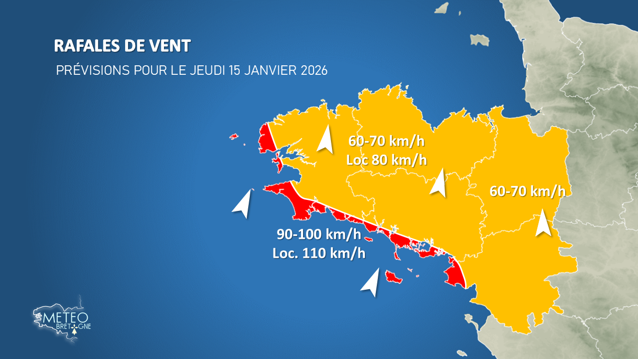 Orienté au sud, le vent s'annonce fort en direction des littoraux finistériens et Morbihannais. Des rafales de 90 à 100 km/h sont envisagées, ponctuellement 100 à 110 km/h en direction des caps et des îles.