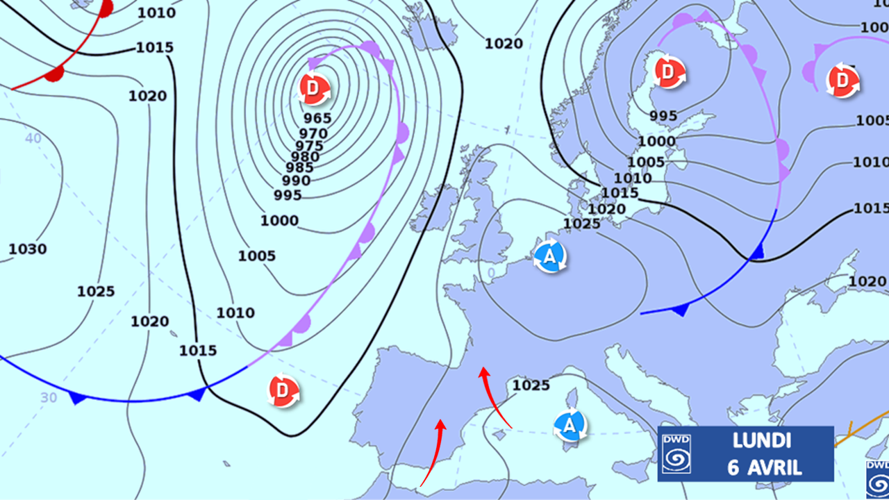 A l’issue d’un samedi dominé par les éclaircies puis d’un dimanche très mitigé voire maussade, la journée de lundi verra les conditions anticycloniques se renforcer entre la France et l’Europe centrale. Dans le même temps, un thalweg (vallée de basses pressions) concernera l’Atlantique Nord. Entre ces deux systèmes, le flux va s’orienter au Sud-Est, permettant un apport d’air sec et très doux en provenance d'Afrique du Nord. Conjugué à un temps bien ensoleillé permettra aux températures d’atteindre des niveaux très élevés pour la saison. La hausse sera plus limitée sur le littoral sud et les côtes d'Iroise (flux maritime).