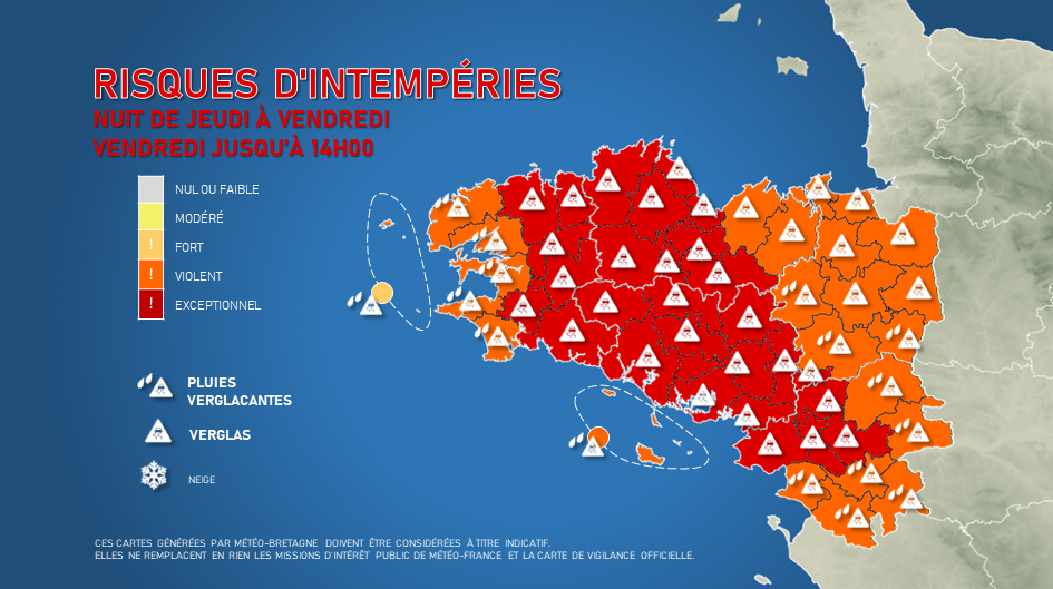 Pour retrouver la traces d'épisode de pluies verglaçantes aussi importants en Bretagne, il faut remonter aux années 1980. En 1987, un épisode avait paralysé un axe entre le Morbihan et le sud de l'Ille-et-Vilaine. Jeudi soir, de petites pluies sont tombées après quelques chutes de neige sur toute la Bretagne. Ces petites pluies ont gelé immédiatement au contact des sols gelés. La situation s'est vraiment dégradée notablement et les messages de prévention sont clairs ce matin : restez chez vous. La pellicule de glace est parfois de 1 cm sur les secteurs placés en niveau exceptionnel. Le salage n'est plus efficace pour une telle quantité de gel et l'adhérence de votre véhicule sur la chaussée est inexistante. L'épisode va perdurer jusqu'au moins 14 heures en début d'après-midi. Les températures vont lentement remonter pour repasser dans le positif à partir de cet horaire.
