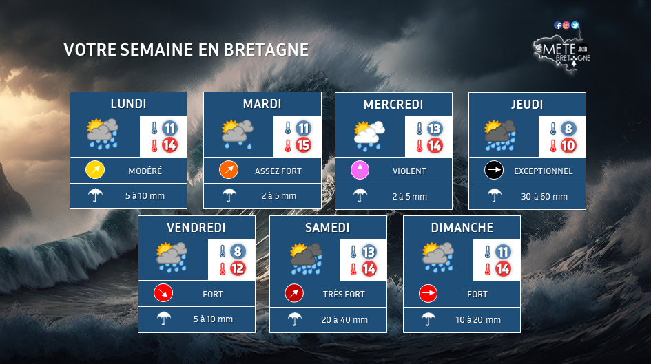 Pour mercredi, les averses sont plus ou moins régulières avec une place pour les éclaircies. Les températures sont homogènes tout au long de la journée avec des valeurs entre 13 et 17°C le plus souvent. En fin de journée, le ciel se couvre à l'approche de la tempête Ciaran. Les rafales de vent sont tempétueuses dans la nuit sur le littoral comme dans l'intérieur des terres avec des vitesses très inhabituelles. Le vent de sud bascule au sud-ouest puis à l'ouest. En matinée de jeudi, la tempête souffle avec virulence sur toute la Bretagne. En bord de mer, le passage de la tempête engendre des submersions très marquées aux abords des estuaires et sur les parties exposées du bord de mer. Du côte du ciel, les pluies sont soutenues avec des cumuls de 30 à 60 mm en l'espace de 12 à 24 heures. Le temps reste agité vendredi avec le ciel de traîne de la tempête. Les rafales de vent peuvent atteindre encore 100 km/h en bord de mer.